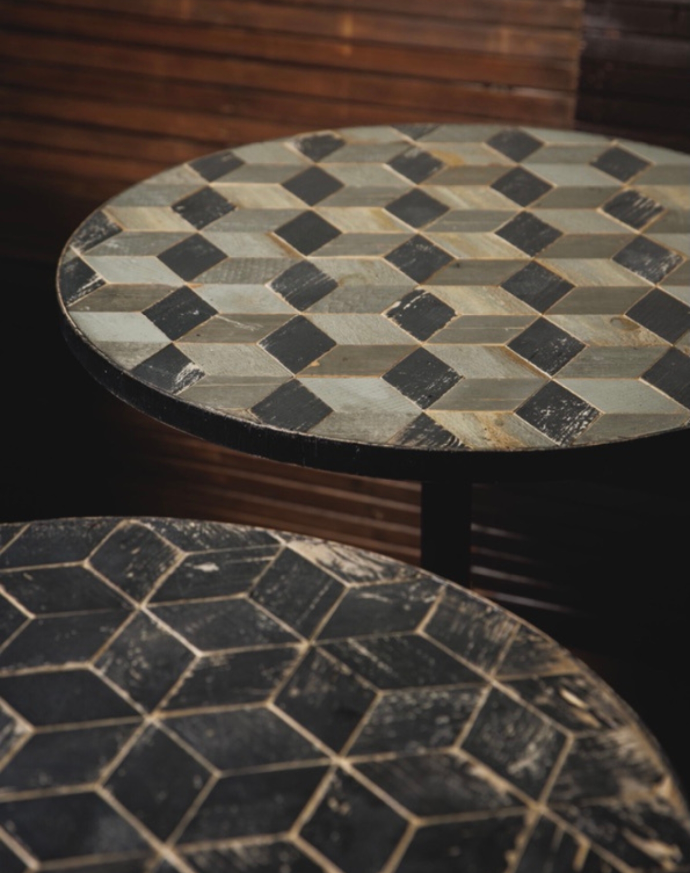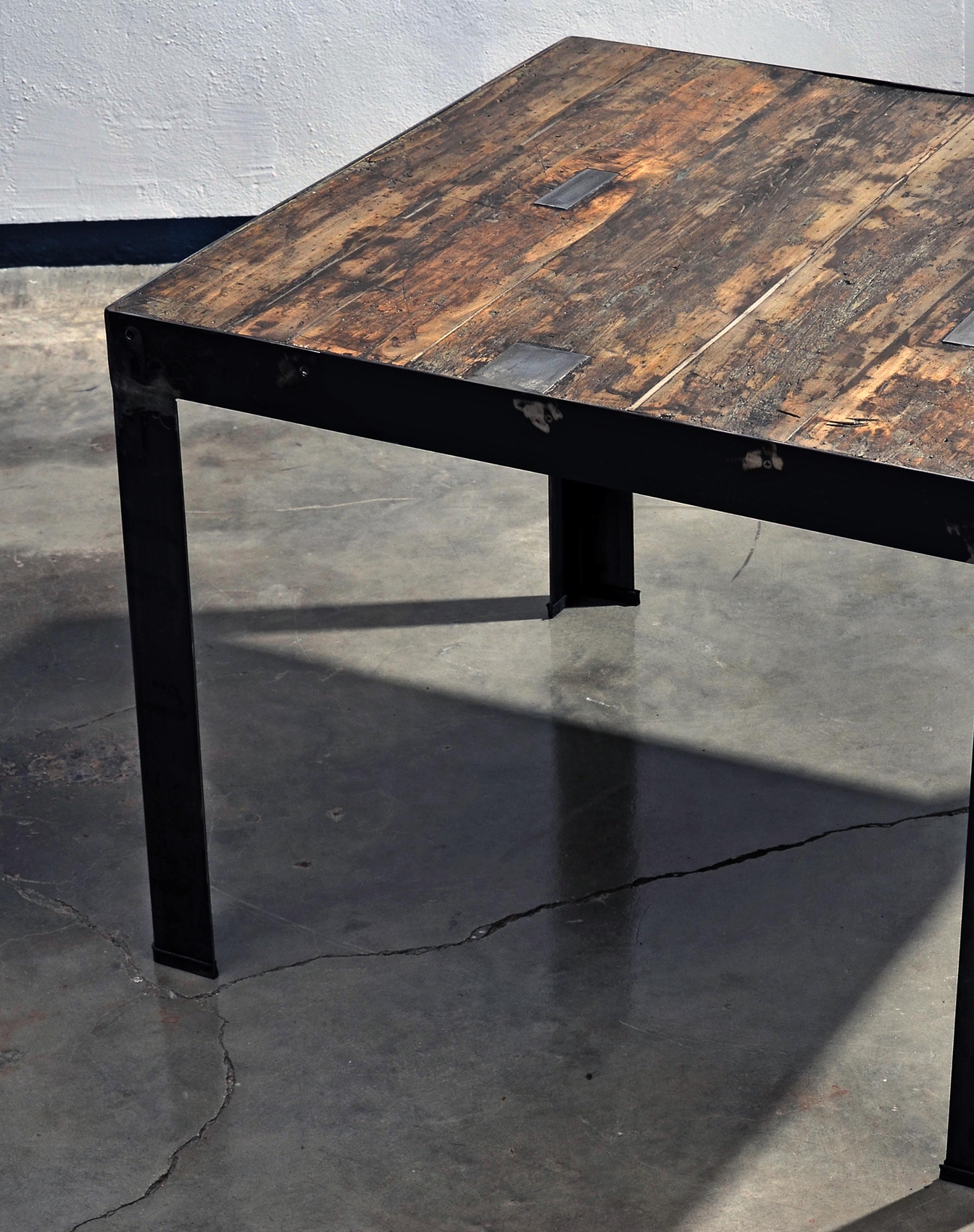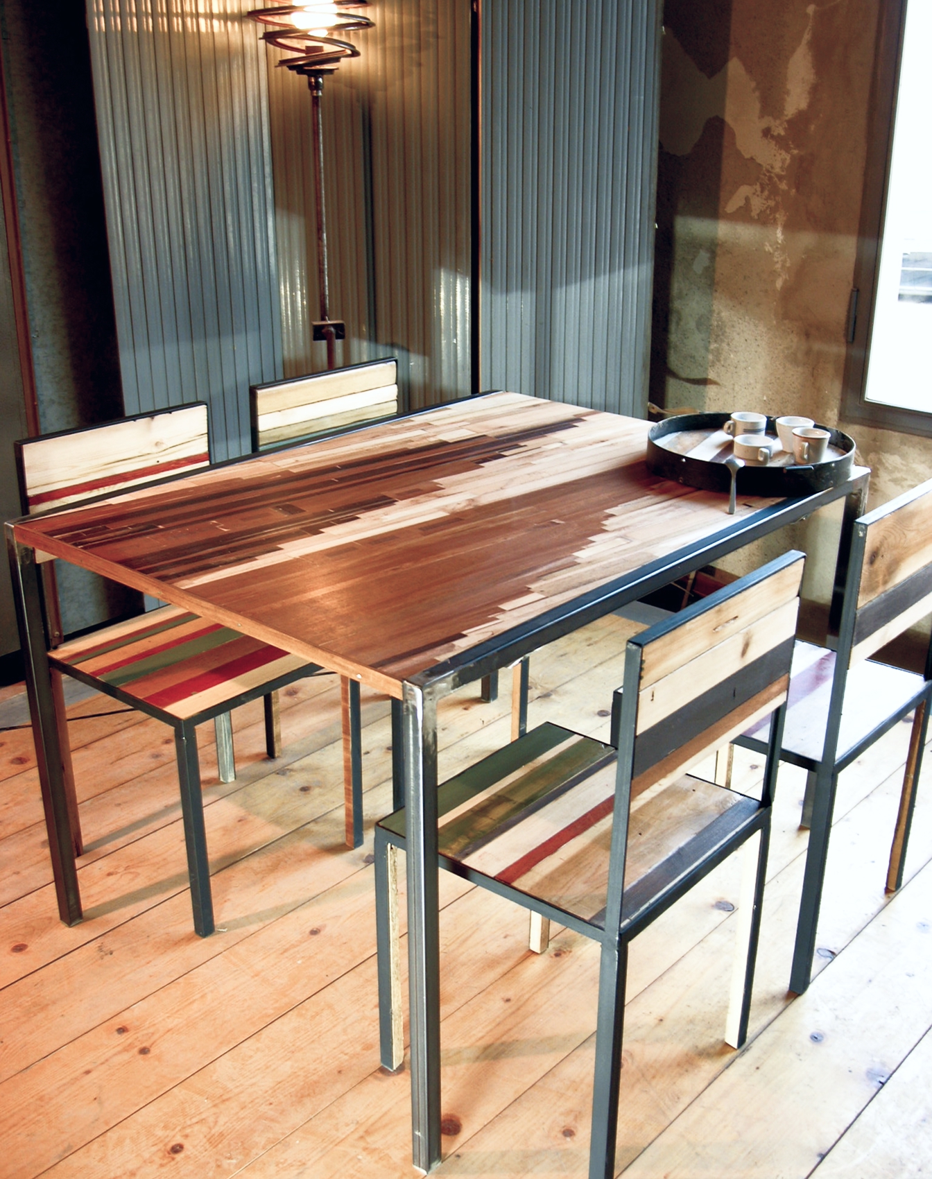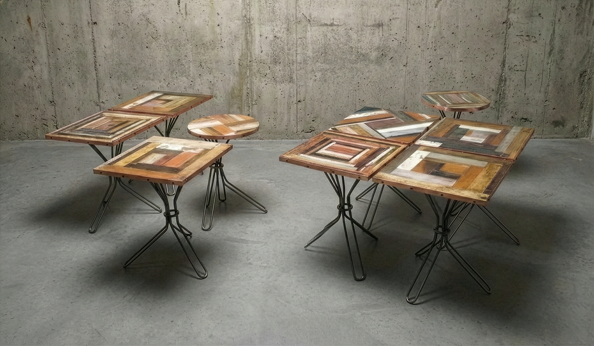 Ogni tavolo è progettato come un pezzo unico, a partire dalla materia che lo compone. Il legno di recupero viene selezionato e ricomposto in pattern grafici o texture continue, dando vita a superfici sempre diverse, mai ripetibili. Forma, proporzioni, struttura e finiture vengono definite in relazione allo spazio e all’uso.