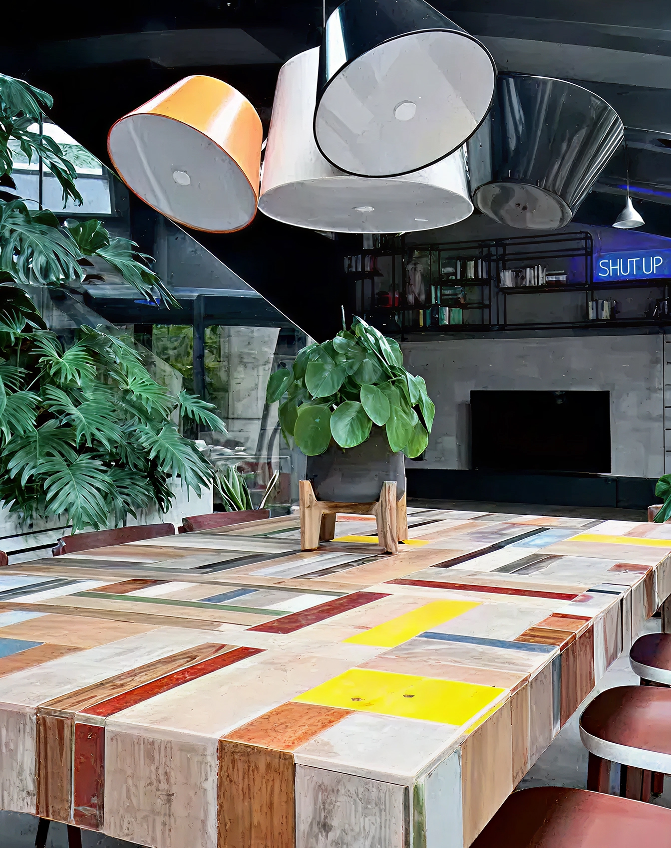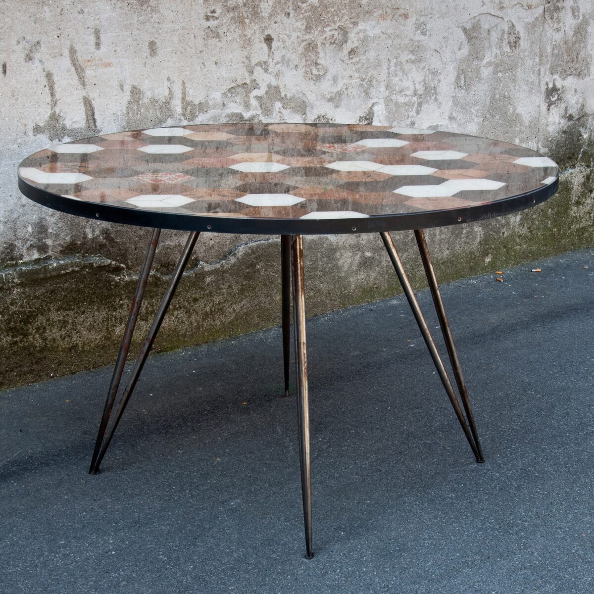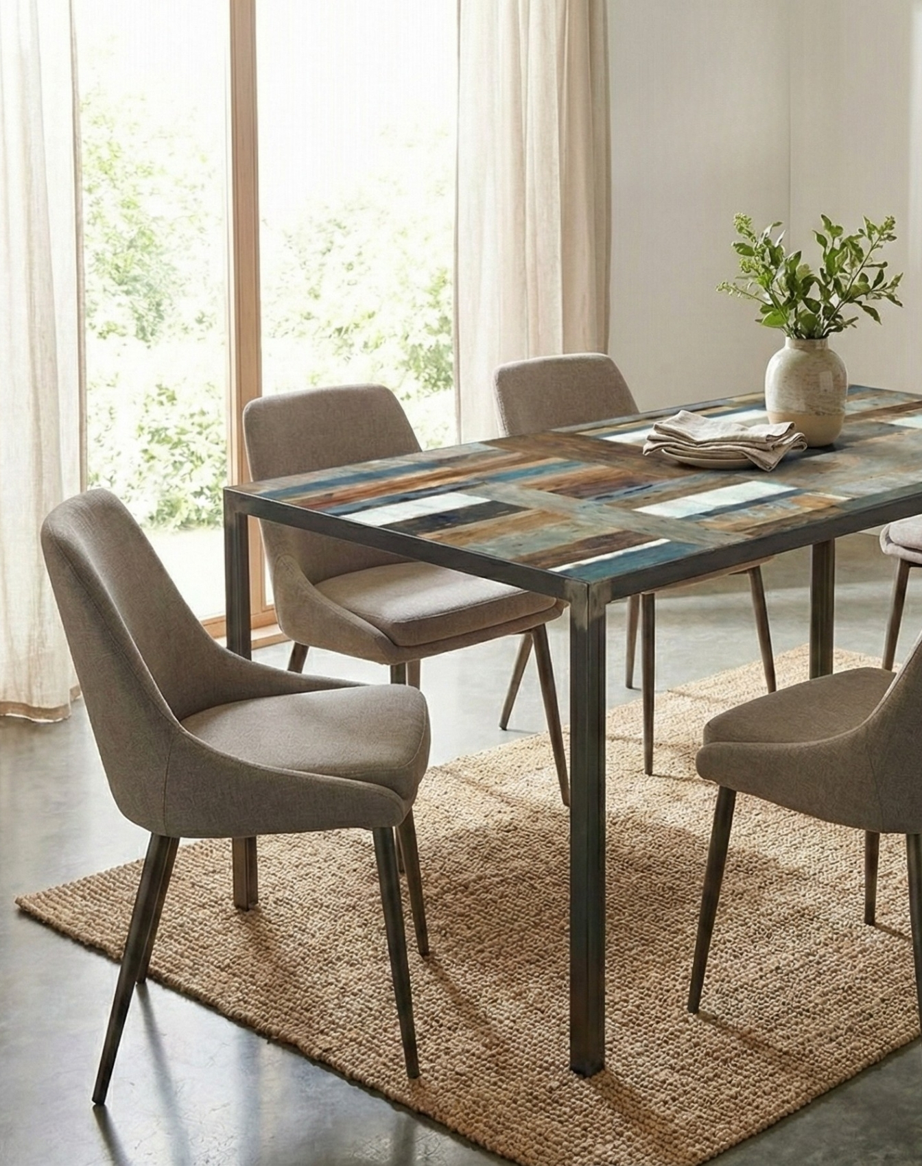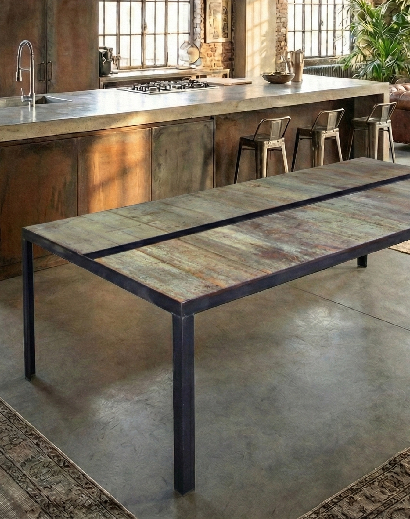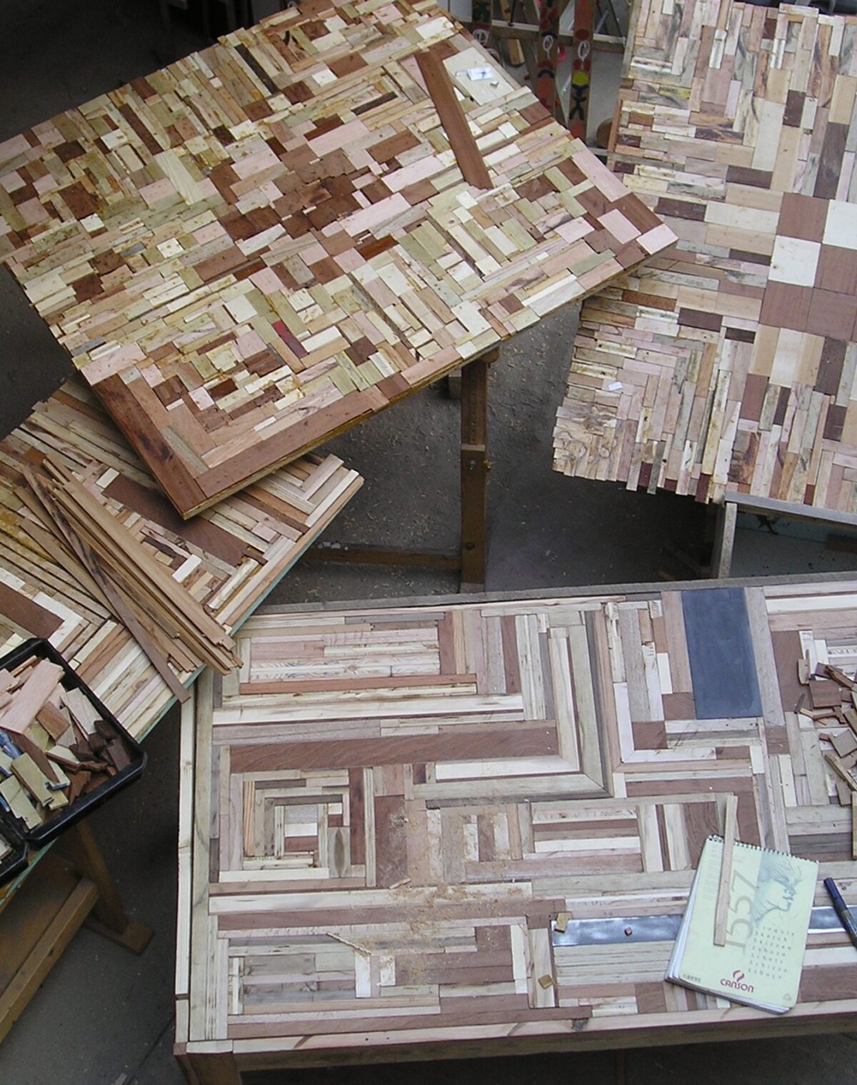 Ogni tavolo è progettato come un pezzo unico, a partire dalla materia che lo compone. Il legno di recupero viene selezionato e ricomposto in pattern grafici o texture continue, dando vita a superfici sempre diverse, mai ripetibili. Forma, proporzioni, struttura e finiture vengono definite in relazione allo spazio e all’uso.