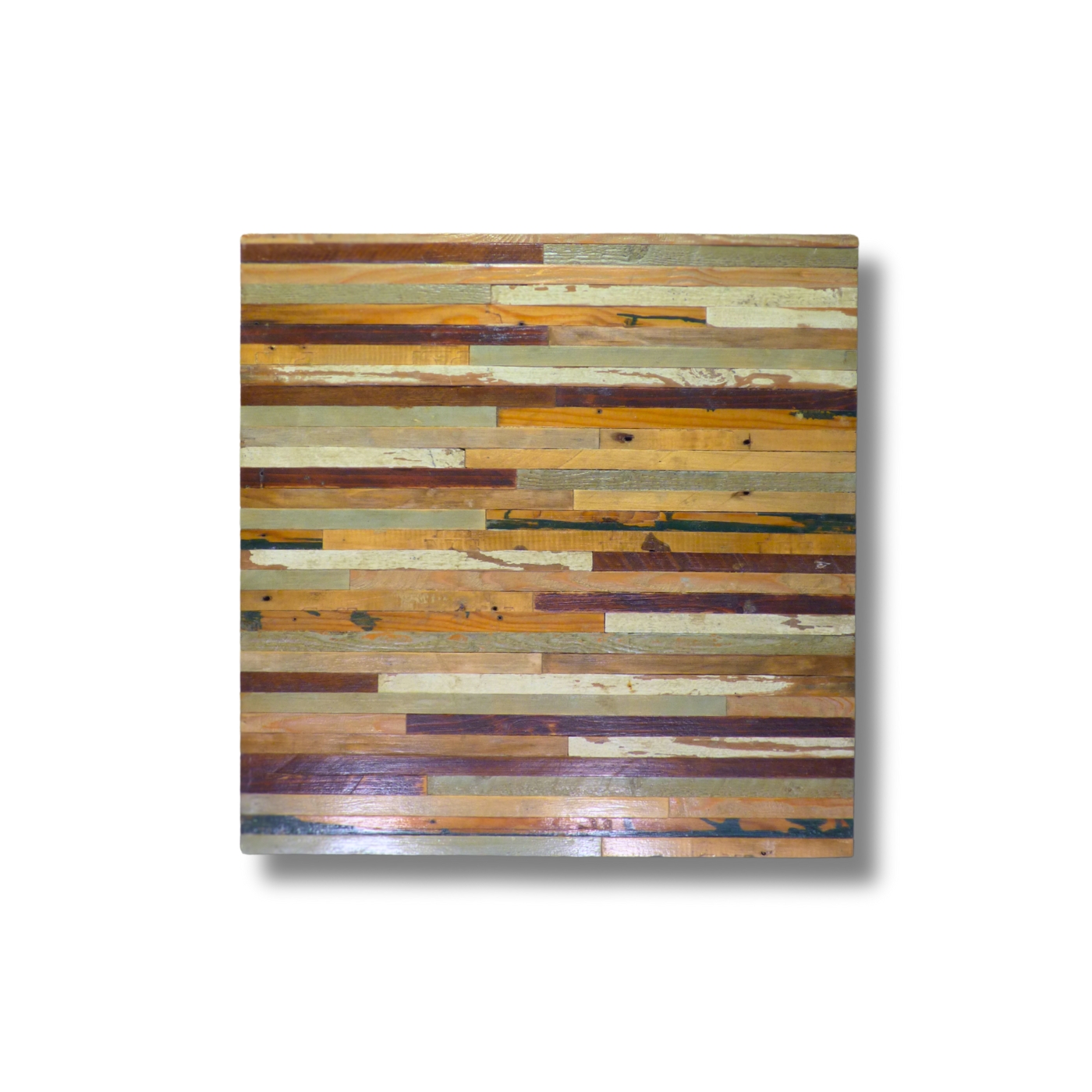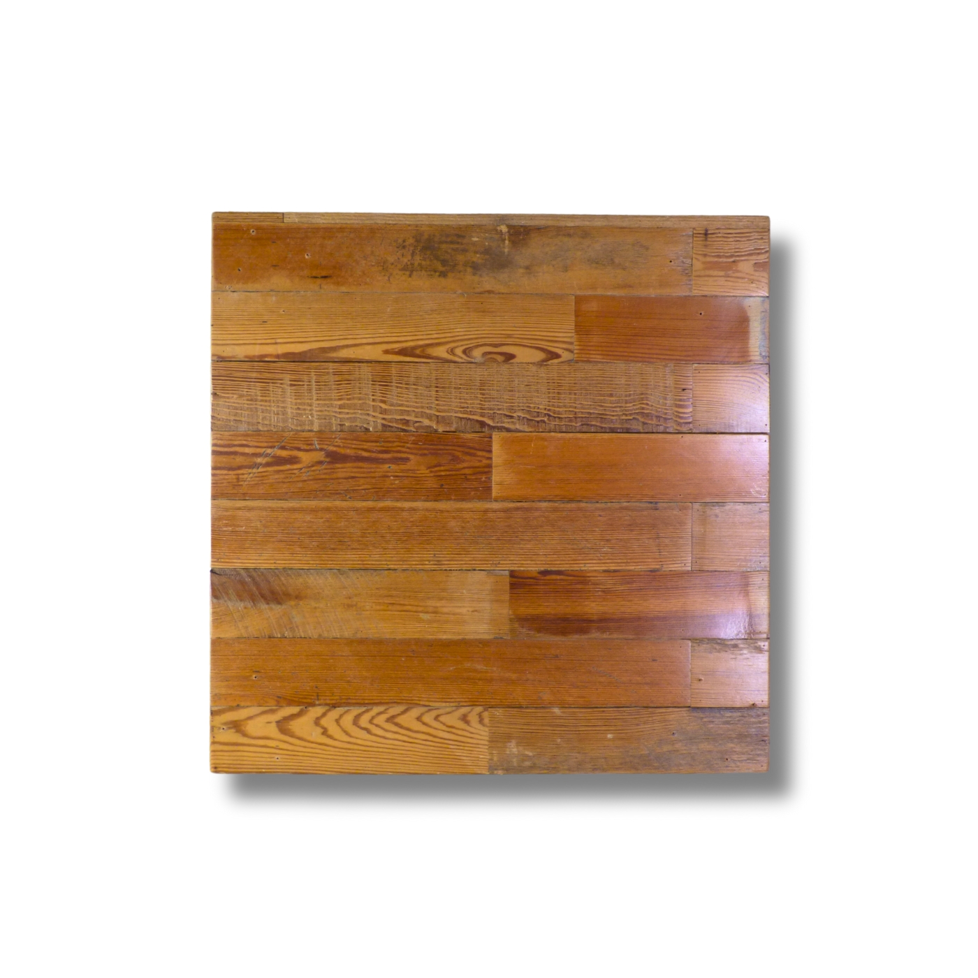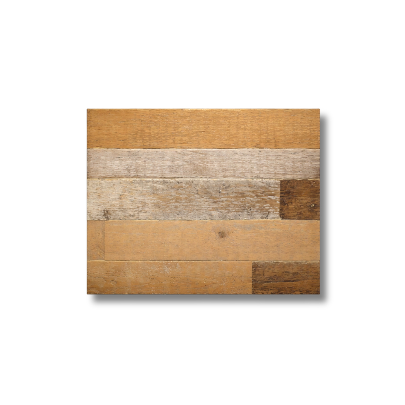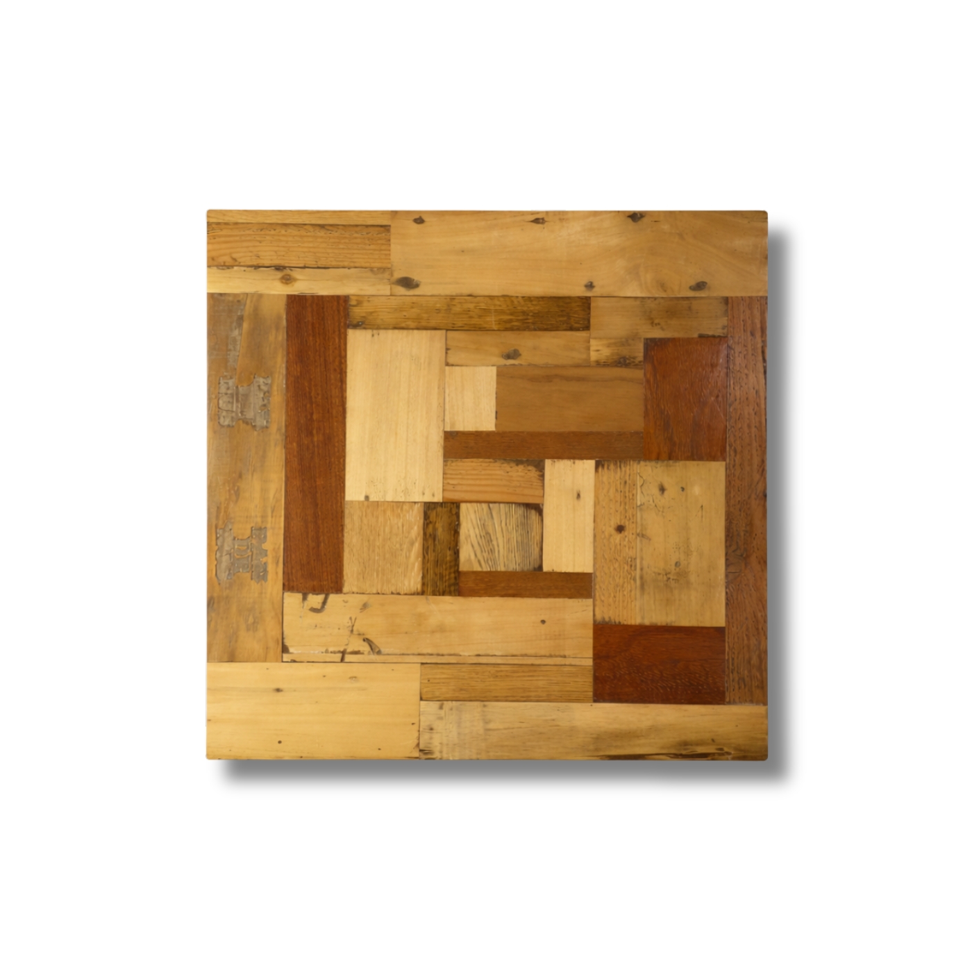 Pattern a mosaico ortogonale con tavole di legno di recupero di formati e larghezze variabili.