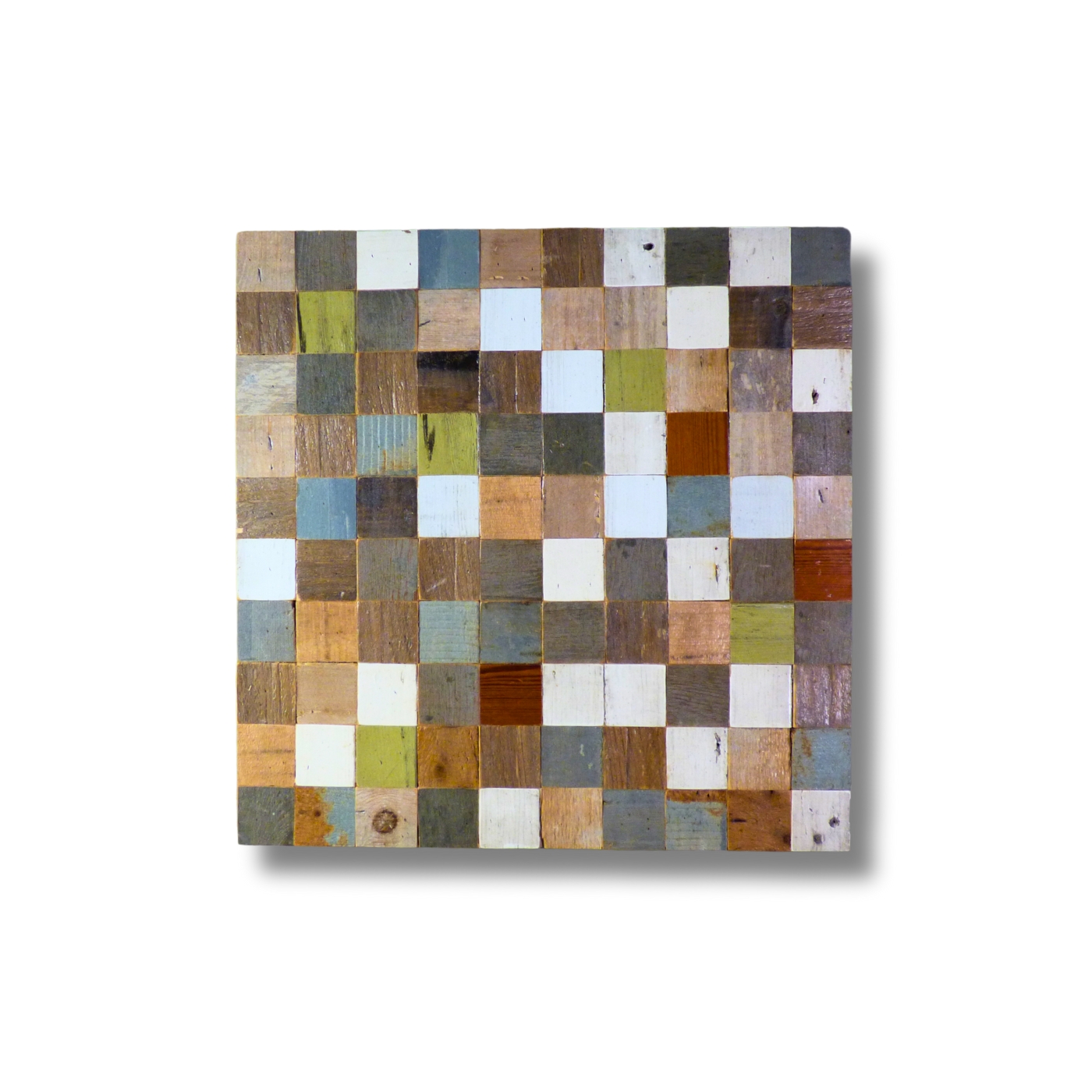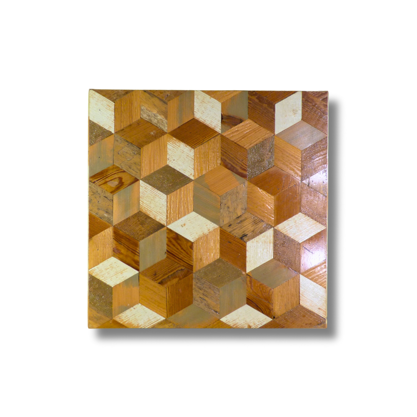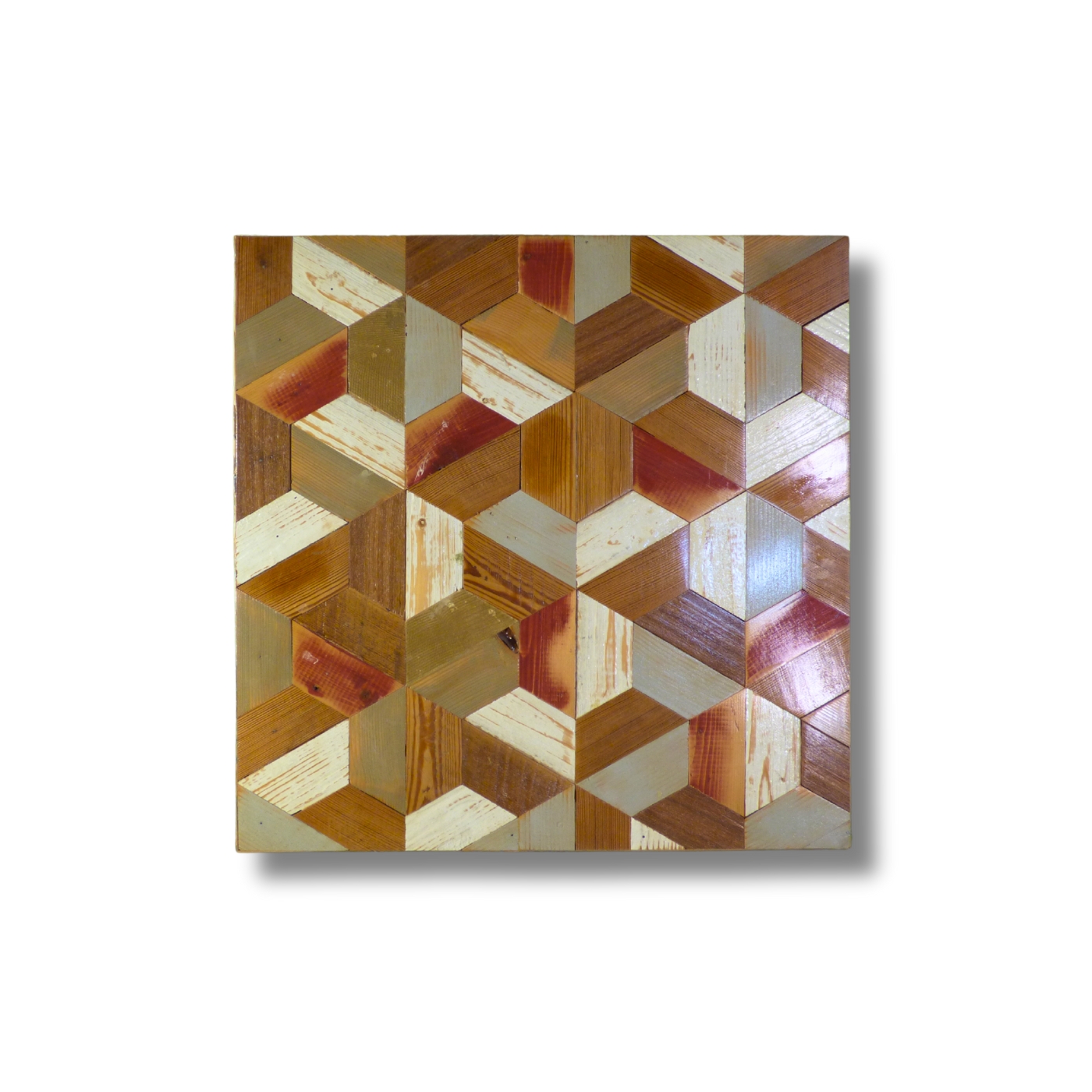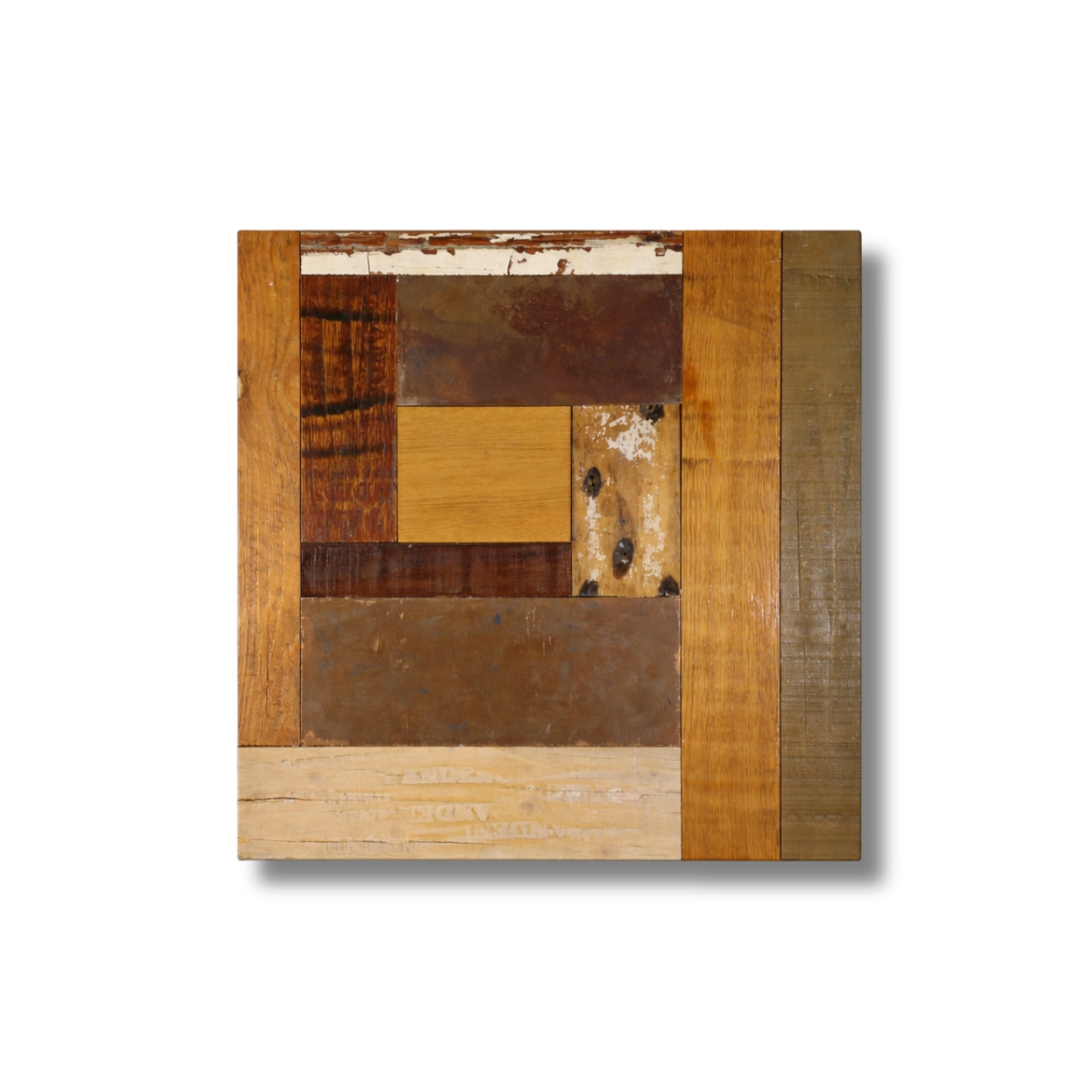 Pattern a mosaico ortogonale con tavole di legno di recupero di formati e larghezze variabili.