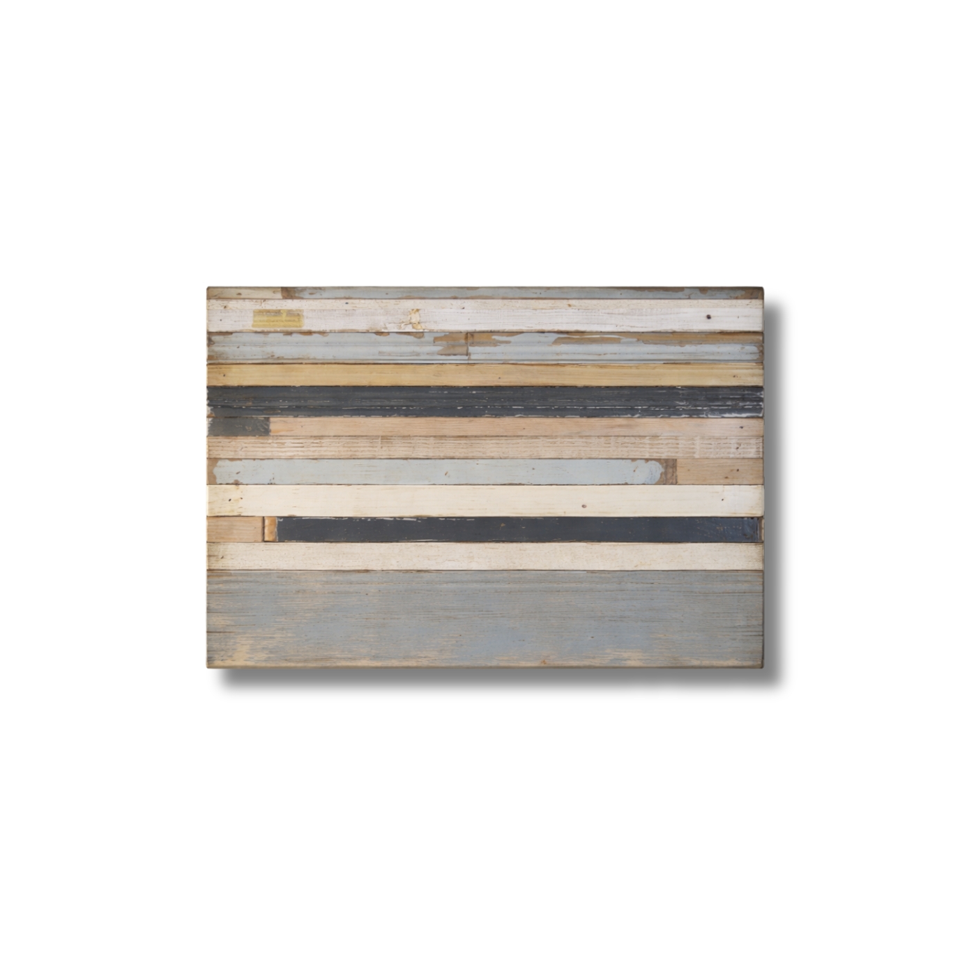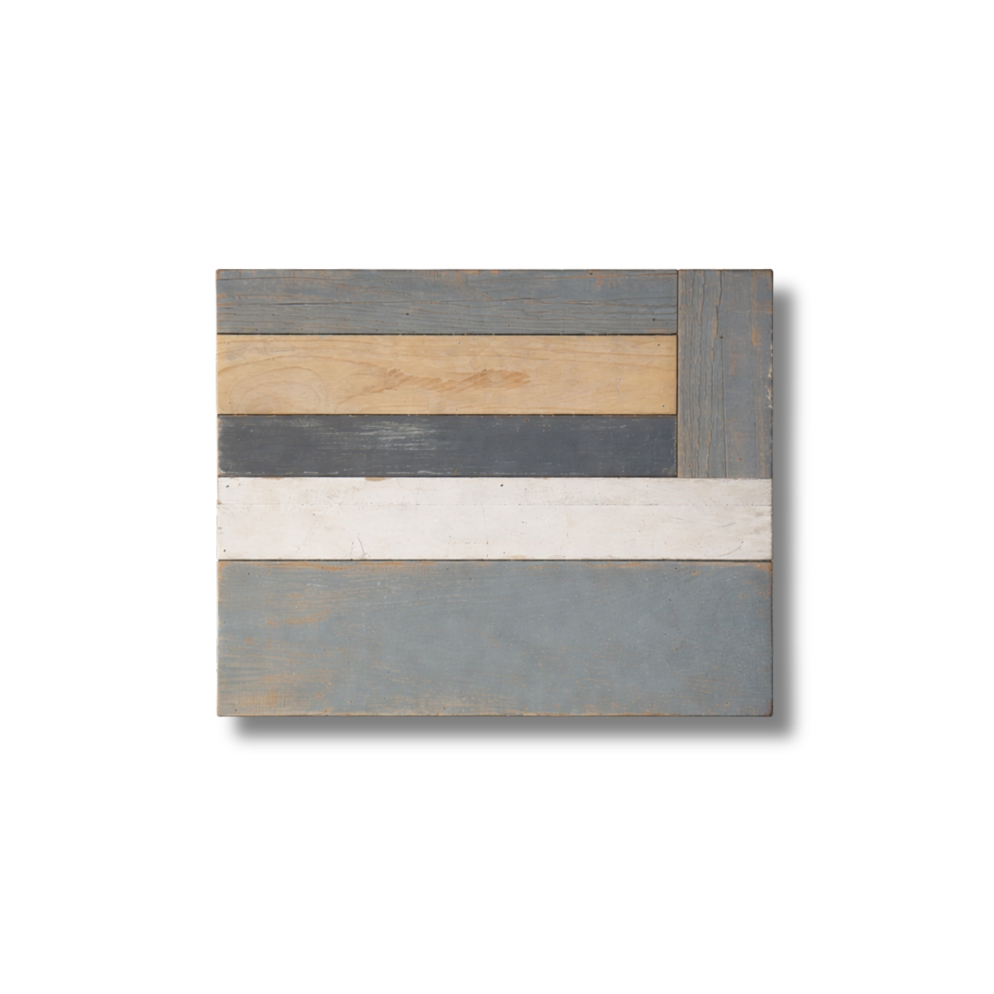 Pattern stratificato a fasce orizzontali con legni schiariti e patine fredde.
