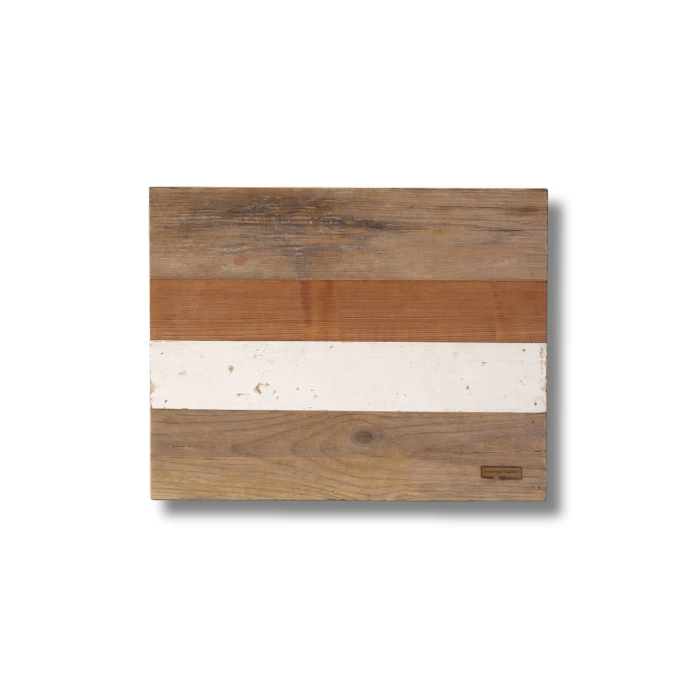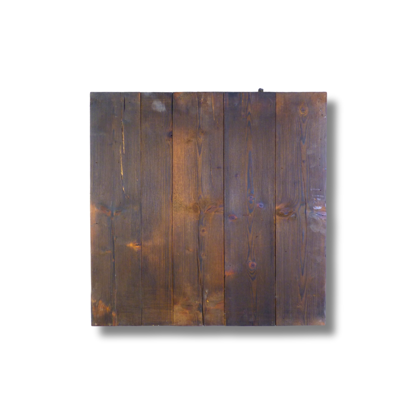 Superficie composta da tavole verticali di recupero, con finitura scurita e segni di bruciatura.