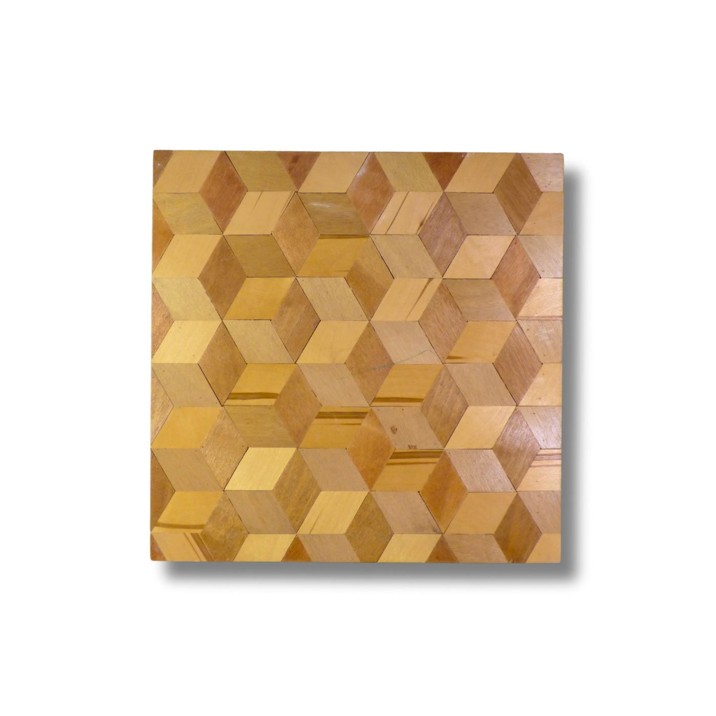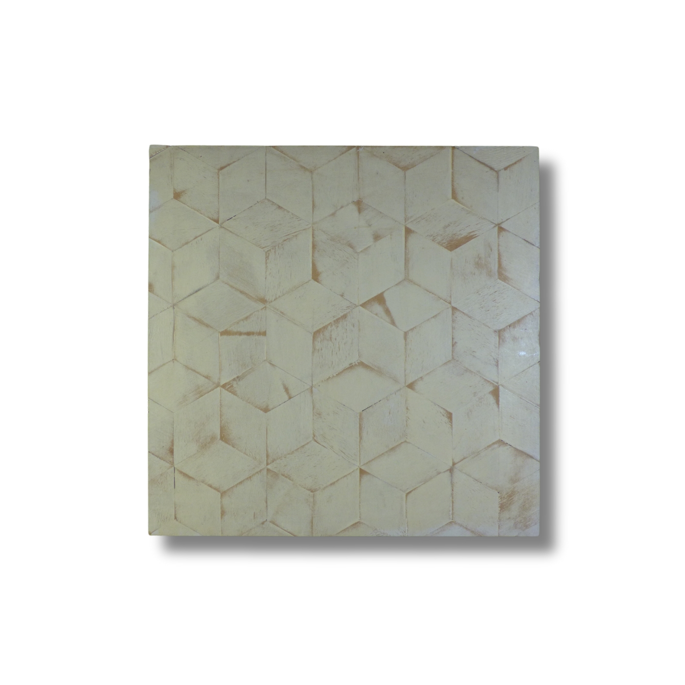 Pattern modulare in legno e cemento, composto da elementi esagonali accostati. La superficie nasce dall’incontro tra materiali diversi, mantenendo leggibilità e tensione geometrica.